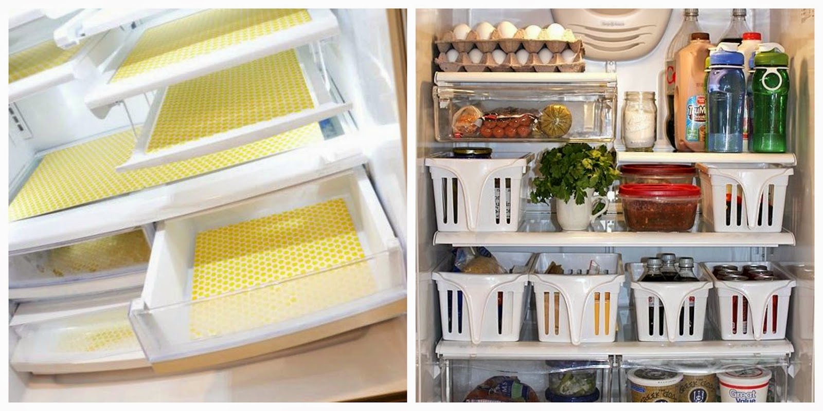 Passiamo al frigorifero? La prima cosa da fare, a mio avviso, è dotarsi di quei rivestimenti per cassetti che Ikea da via a pochi spiccioli: la roba non scivolerà più e se qualcosa si versa o sporca si pulisce in un attimo.